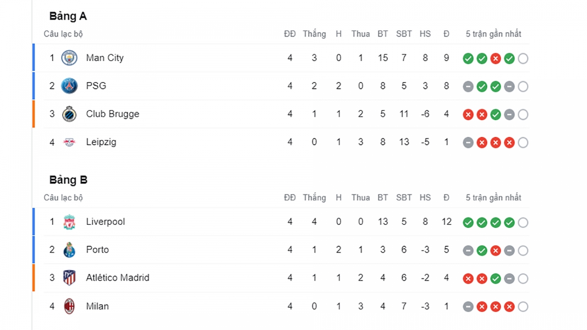 Cập nhật bảng xếp hạng Cúp C1 châu Âu mới nhất: