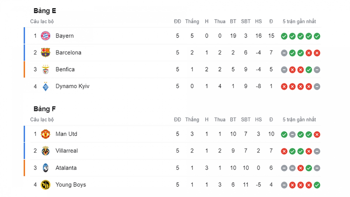 Giống như Liverpool ở bảng B, Bayern cũng tỏ ra quá mạnh ở bảng E với 15 điểm tuyệt đối sau 5 lượt trận, ghi 19 bàn và chỉ để lọt lưới 3 lần. Mới nhất, đội bóng nước Đức đã vượt qua Dynamo Kiev 2-1 để chắc chắn đứng đầu bảng.
