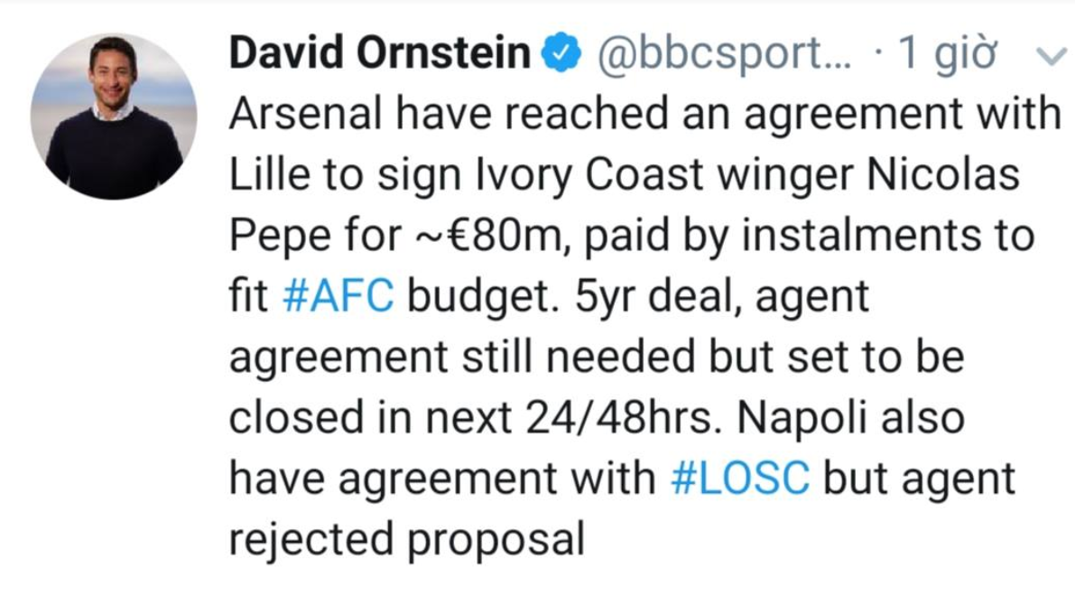 Cụ thể, nhà báo David Ostern của BBC đã đăng tải thông tin trên Twitter rằng: Arsenal đã đạt được thỏa thuận chiêu mộ Nicolas Pepe với giá 80 triệu Euro (72 triệu Bảng) từ Lille. Bản hợp đồng có thời hạn 5 năm và Arsenal cần khoảng 1 - 2 ngày nữa là sẽ khép lại thương vụ đình đám này.