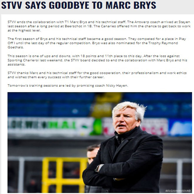 "STVV thông báo chấm dứt hợp tác với Marc Brys và đội ngũ kỹ thuật của ông ấy. HLV sinh ra ở Antwerp đã đến Stayen mùa trước sau một thời gian dài dẫn dắt Beerschot. Đội bóng đã tạo mọi điều kiện làm việc tốt nhất cho ông ấy".