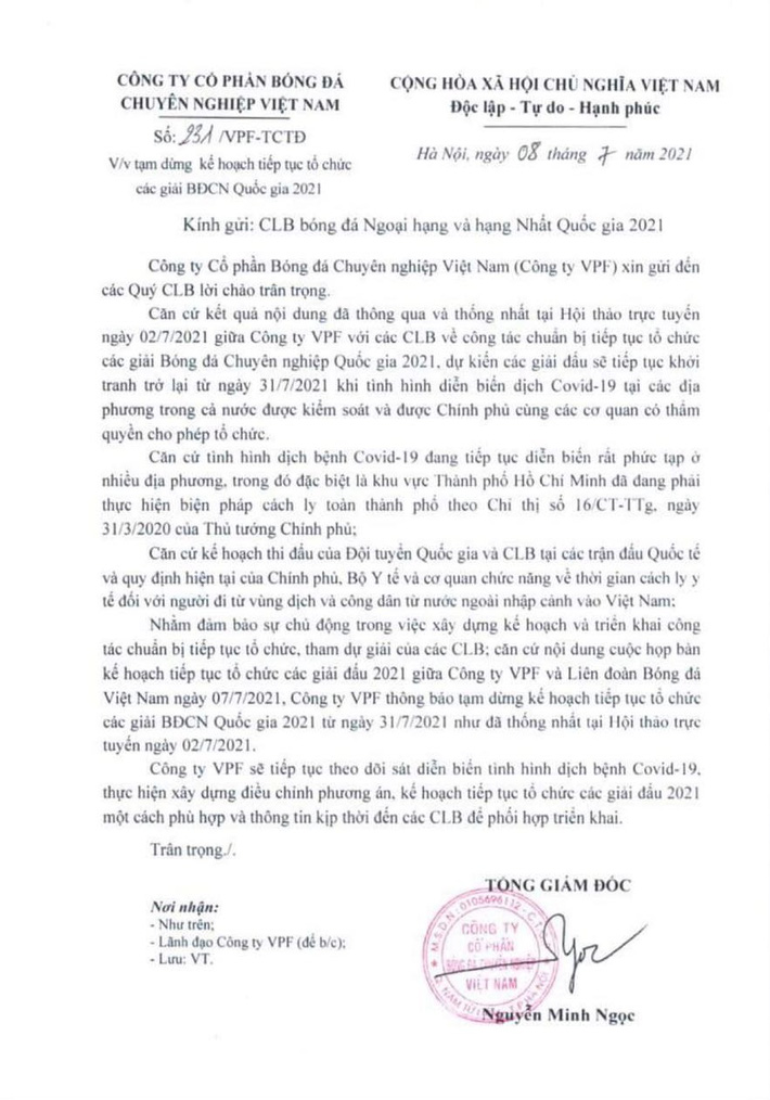 Trong công văn được gửi tới các CLB vào chiều nay (8/7), Công ty VPF đã phát đi thông báo tạm dừng kế hoạch tiếp tục tổ chức các giải bóng đá chuyên nghiệp quốc gia 2021 (V.League và hạng Nhất) như kế hoạch mới được thông qua,