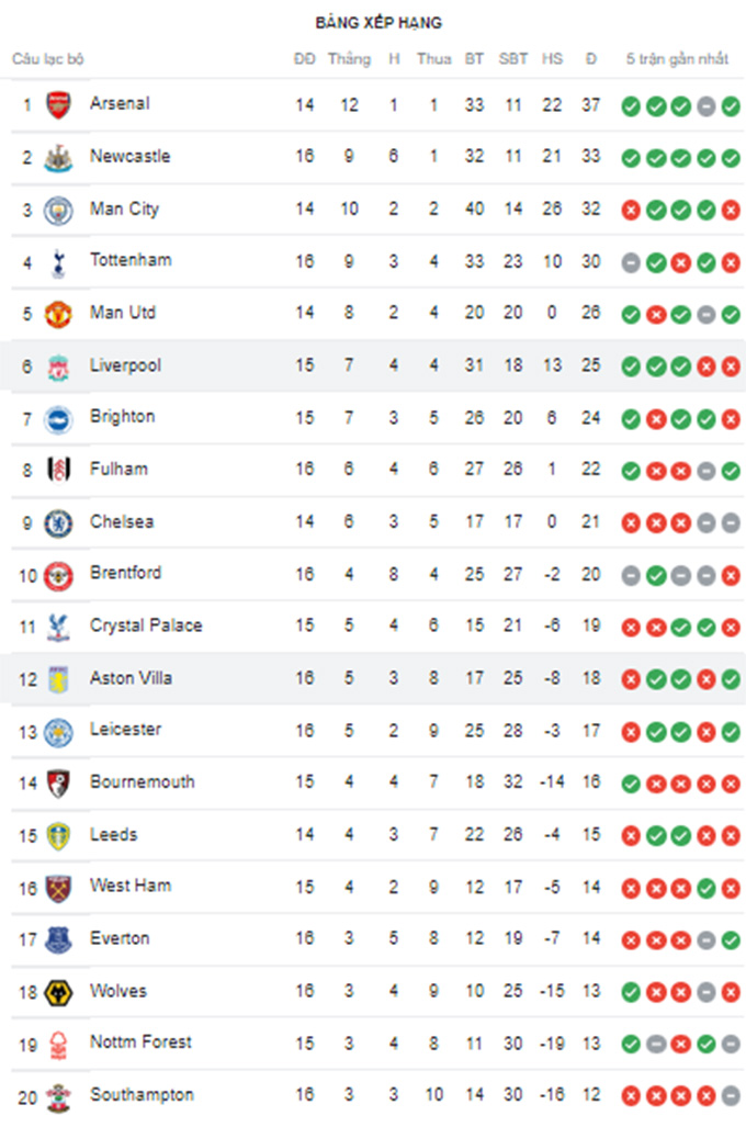 Đánh bại Aston Villa với tỷ số cách biệt 3-1 trong ngày Lễ tặng quà, phần thưởng mà Liverpool nhận được là 3 điểm trọn vẹn. Dù vậy, họ vẫn chỉ xếp thứ 6 trên BXH với 25 điểm có được sau 15 trận và còn rất ít cơ hội cạnh tranh ngôi vô địch.
