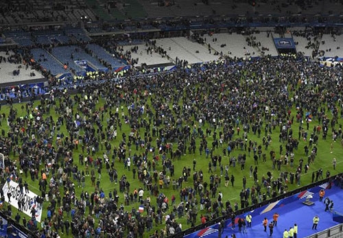 Hình ảnh từ sân Stade de France khi người hâm mộ được yêu cầu nán lại để giữ an toàn. |