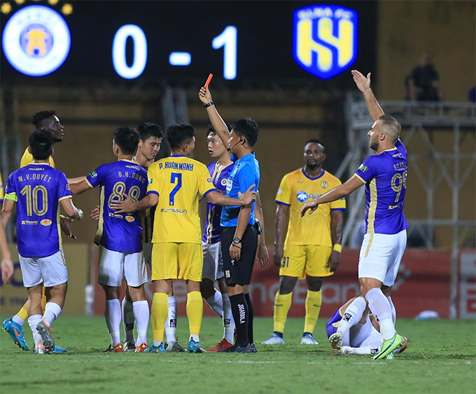 Ở phút 49, Olaha lcó một cú húc cùi chỏ không đáng vào mặt Đậu Văn Toàn dẫn đến phải nhận thẻ đỏ trực tiếp rời sân. Trong thế 10 đấu 11, hàng thủ SLNA đã phạm sai lầm khi Thái Bá Sang để bóng chạm tay trong vòng cấm địa. Siladi không gặp sai lầm nào trên chấm 11m để gỡ hòa cho Hà Nội FC. Sau bàn thủng lưới, SLNA đã chơi rất nỗ lực. Đáng chú ý là nỗ lực của các cá nhân như Phan Văn Đức, Xuân Mạnh nhưng đã không mang về bàn thắng.