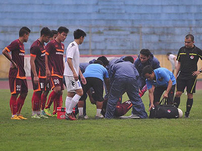 Sau một pha va chạm mạnh với cầu thủ HN T&T, trung vệ Bùi Tiến Dũng của đội tuyển Olympic VN đã bị choáng, nằm bất động trên sân. Ngay lập tức cáng đã được đưa vào sân để khiêng anh ra ngoài.