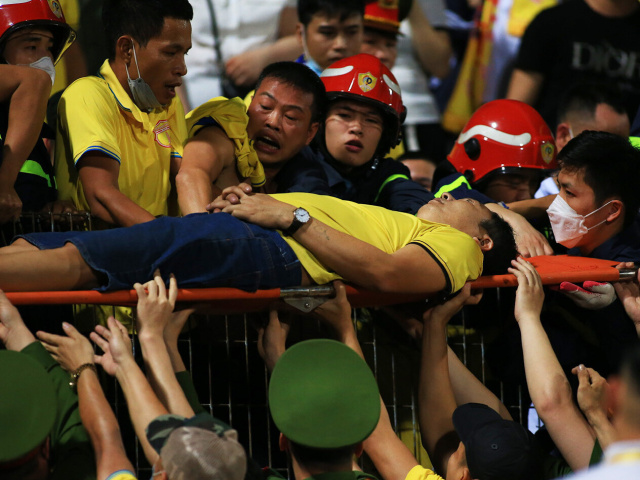 Lực lượng an ninh và y tế sân Hàng Đẫy giải cứu một CĐV Nam Định bị ngạt thở trên khán đài, trước thời điểm diễn ra trận đấu giữa CAHN vs Nam Định, vòng 7 V-League 2023.