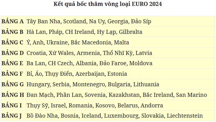 Trong khi đó ở bảng B, ĐKVĐTG Pháp sẽ chạm trán Hà Lan. Giống như bảng của Italia và Anh, Pháp và Hà Lan quá vượt trội so với CH Ireland, Hy Lạp và Gilbralta. Bảng A, Na Uy với sự xuất sắc của Erling Haaland hay Martin Odegaard sẽ là thách thức lớn dành cho Tây Ban Nha. Bên cạnh đó, ĐT Scotland với nền tảng lực lượng là những cầu thủ đang chơi ở các CLB hàng đầu Ngoại hạng Anh sẵn sàng thách thức mọi đối thủ.