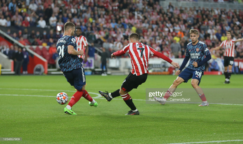 Phút 73, Brentford có quả ném biên sát đường biên ngang bên cánh trái. Bóng được ném thẳng vào vòng cấm địa Arsenal với lực khá mạnh. Trung vệ Pablo Mari và hậu vệ cánh Chambers cùng nhảy lên nhưng không đoán trúng điểm rơi. Phía bên trong, tân binh trị giá 50 triệu bảng Ben White tỏ ra vô cùng thụ động khi để trái bóng bật qua trước mặt và đi vào khoảng trống sau lưng.