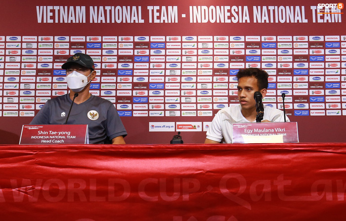 Egy Maulana Vikri đi cùng HLV Shin Tae-yong vào phòng họp báo lúc 18h10. Điều phối viên nhắc nhở cầu thủ Indonesia đeo khẩu trang nhưng anh quên mang. Nếu không có khẩu trang, buổi họp báo sẽ chưa thể bắt đầu (Ảnh: Hiếu Lương)