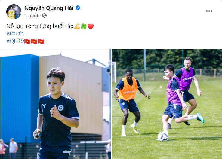 Trong những chia sẻ mới nhất trên trang cá nhân của mình, Quang Hải tỏ ra vô cùng hạnh phúc tại Pau FC. Chân sút người Đông Anh cho biết bản thân vẫn đang miệt mài nỗ lực để khẳng định được giá trị chuyên môn: "Nỗ lực trong từng buổi tập", Quang Hải chia sẻ dòng trạng thái trên MXH. Dưới bài viết của tân binh Pau FC, rất nhiều NHM đã đồng loạt gửi tới anh những lời chúc tốt đẹp nhất. Tất cả đều đang chờ đợi ngày Quang Hải ra sân tại nước Pháp.
