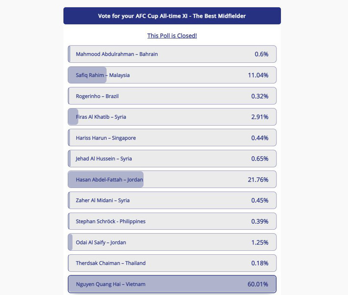 Hai người xếp sau cầu thủ CLB Hà Nội lần lượt là Hasan Abdel-Fattah (21,76%) và Safiq Rahim (11,4%). Trong khi đó, những cầu thủ còn lại nhận về tỷ lệ phiếu bầu không quá 3%.