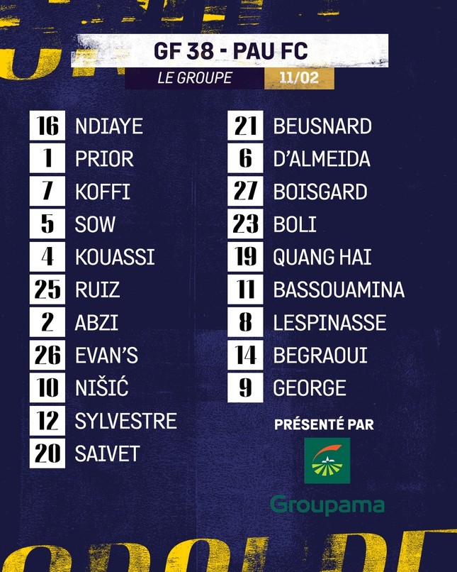Ở trận đấu này, Nguyễn Quang Hải không xuất hiện trên ghế dự bị của Pau FC như kế hoạch ban đầu. Vào hôm qua, tiền vệ tuyển Việt Nam vẫn được HLV Didier Tholot điền tên vào danh sách đăng ký thi đấu của Pau FC và lẽ ra phải cùng đội bóng này hành quân đến sân của Grenoble Foot. Tuy nhiên, Quang Hải đã xin HLV người Pháp rút lui để xuống thi đấu cho Pau B (đội dự bị của Pau FC).