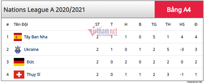 Đại thắng 4-0 trước Ukraine, Tây Ban Nha đã có 4 điểm sau 2 trận và chiếm ngôi đầu bảng A4 UEFA Nations League từ chính đối thủ này.