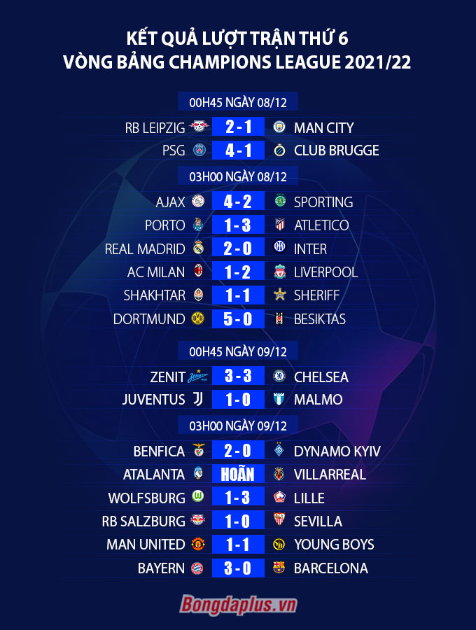Kết quả cuối cùng trận MU vs Young Boys là 1-1. Man United giành suất qua vòng bảng với ngôi đầu trong khi Young Boys đứng bét bảng. Chiếc vé còn lại của bảng F là cuộc cạnh tranh giữa Villarreal và Atalanta nhưng trận đấu này đã bị hoãn lại do tuyết rơi quá dày.