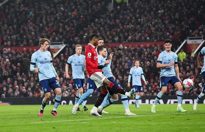 Chỉ 4 phút sau, MU cuối cùng cũng đã tìm được điều mình cần là bàn thắng. Từ quả phạt góc bên cánh trái, bóng được cầu thủ Brentford phá ra. Antony có mặt đón bóng ở ngoài vòng cấm rồi một lần nữa rót vào vòng cấm địa. Tiền vệ Sabitzer bật cao đánh đầu chuyền cho Rashford ra chân ở cự ly gần tung lưới Brentford.