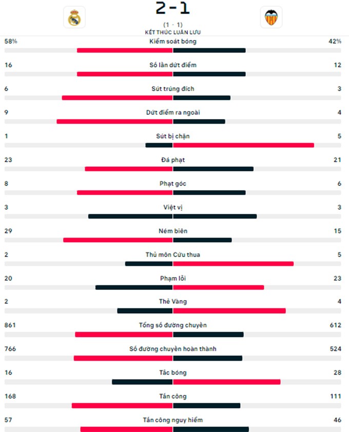 Trong khi đó, có đến 2 cầu thủ Valencia là Comert và Gaya không thể đưa được bóng vào lưới từ cự ly 11m. Nhọc nhằn vượt qua Valencia, Real sẽ chơi trận chung kết Siêu cúp Tây Ban Nha vào ngày 15/1 tới. Đối thủ của họ là đội thắng trong cặp bán kết còn lại giữa Betis và Barca.