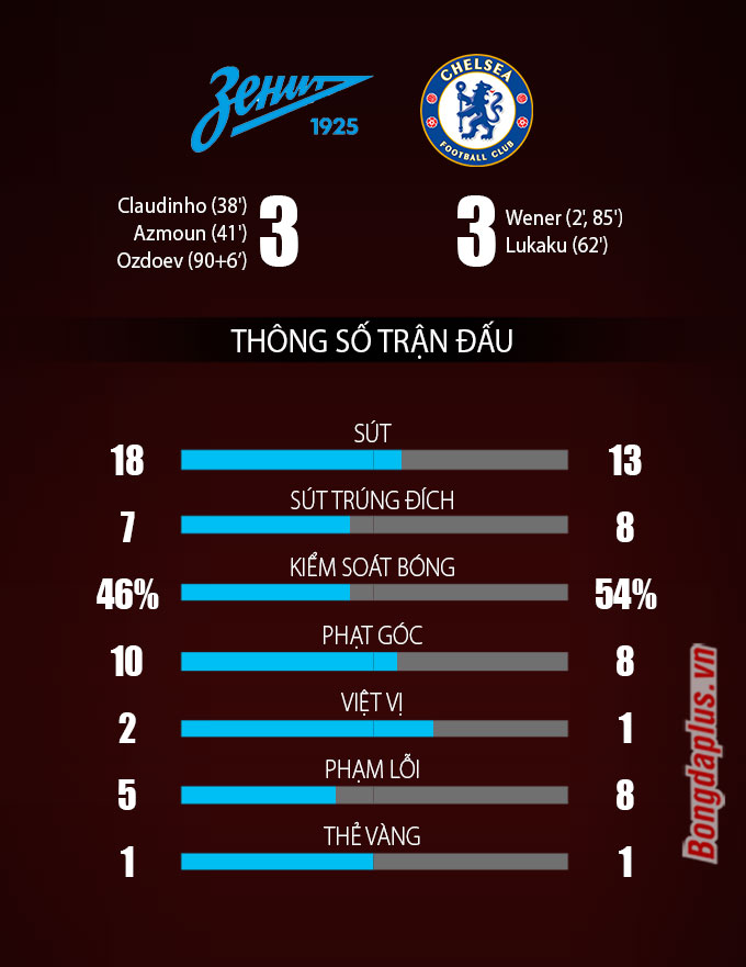 Khi tưởng như 3 điểm nằm trọn trong tay Chelsea thì Ozdoev tỏa sáng với cú bắt vô-lê đẹp mắt ở sát vòng 16m50 của đội ĐKVĐ Champions League, quân bình tỷ số 3-3 cho Zenit. Hòa đáng tiếc, Chelsea (12 điểm) mất ngôi đầu bảng vào tay Juventus (15 điểm). Trong khi đó, Zenit (5 điểm) xuống chơi ở Europa League.