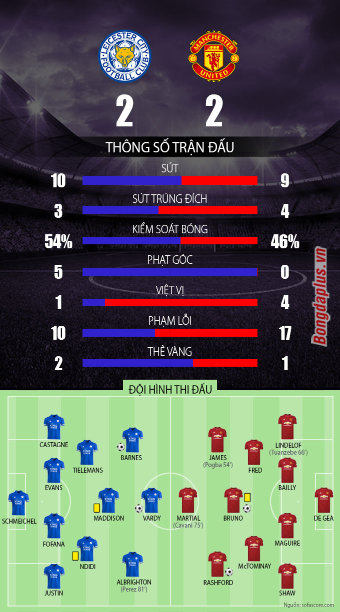 Tuy nhiên, niềm vui của Quỷ đỏ chỉ kéo dài vỏn vẹn 6 phút. Phút 85, từ quả căng vào của Ayoze Perez bên cánh phải, các trung vệ của M.U đã bỏ quên Vardy, giúp chân sút lão luyện này có quá nhiều khoảng trống để dứt điểm cận thành gỡ hòa 2-2 cho Leicester.