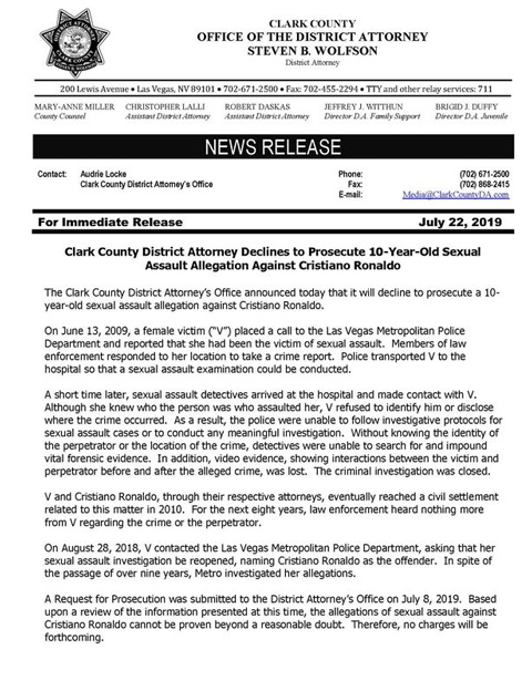 Yêu cầu truy tố đã được đệ trình lên Văn phòng Biện lý quận vào ngày 8/7/2019. Dựa trên đánh giá thông tin được trình bày tại thời điểm này, các cáo buộc tấn công tình dực đối với Cristiano Ronaldo không có bằng chứng xác thực. Vì thế, không có án phạt nào được đưa ra".