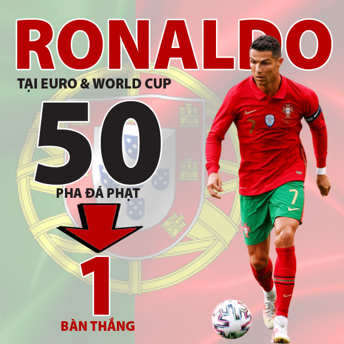 Nhưng bất chấp nhiều kỷ lục mà Ronaldo đang nắm giữ, thống kê về sút phạt trực tiếp của anh tại các giải đấu lớn là cực tệ. Theo đó, ngôi sao 36 tuổi đã thực hiện tới 50 quả đá phạt nhưng mới chỉ có đúng 1 bàn thắng.