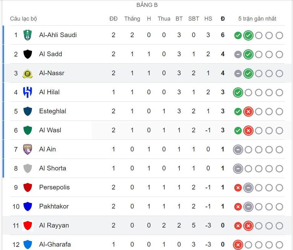 Với 4 điểm sau 2 trận, Al Nassr tạm xếp thứ 3 bảng xếp hạng AFC Champions League, sau Al Ahli và Al Sadd.