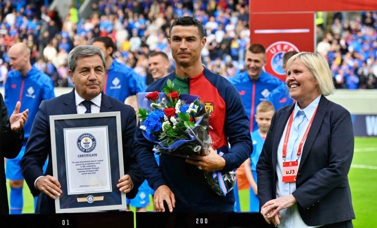 Ronaldo lập kỷ lục Guinness và nhận giấy chứng nhận ở trận đấu này khi trở thành cầu thủ bóng đá nam đầu tiên trên thế giới có tới 200 trận ra sân trong màu áo đội tuyển quốc gia.