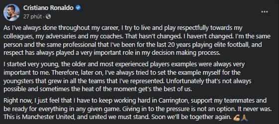 Theo Ronaldo, điều duy nhất anh cảm thấy cần lúc này là tiếp tục làm việc chăm chỉ ở Carrington, hỗ trợ đồng đội và sẵn sàng ra sân trong mọi trận đấu. "Tôi cảm thấy bản thân cần tiếp tục làm việc chăm chỉ hơn, hỗ trợ đồng đội và sẵn sàng cho những công việc không tên. Từ bỏ khi gặp áp lực không phải lựa chọn của tôi. Đây là MU, là tập thể đoàn kết mà chúng tôi đanng đại diện. Chẳng bao lâu nữa, chúng ta sẽ lại bên nhau" siêu sao 37 tuổi khép lại tâm thư.