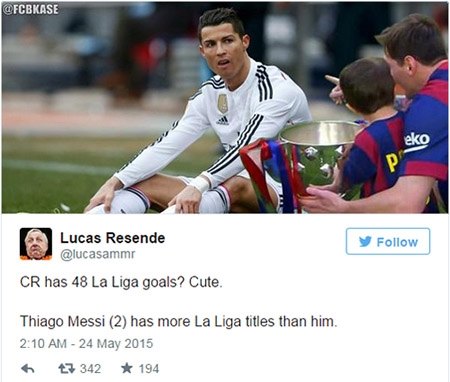 Ngay sau khi chứng kiến sự xuất hiện của bé Thiago trên sân Nou Camp, nhiều người đã dùng những hình ảnh của hai bố con Messi để châm biếm Cristiano Ronaldo, cầu thủ ghi được tới 48 bàn ở La Liga mùa giải này. Họ hy vọng sau này Thiago sẽ có thể nối nghiệp và thành công như bố bây giờ. Tất nhiên, mục đích của những bức ảnh chế chỉ là muốn đem lại những điều vui vẻ vì bản thân số 10 của Barca là một cầu thủ rất hiền lành và khiêm tốn.