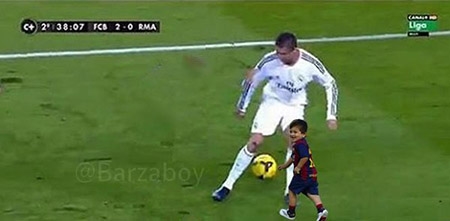 Thiago Messi đi bóng băng băng trong khi Ronaldo lại bị hụt hơi ở phía sau. |