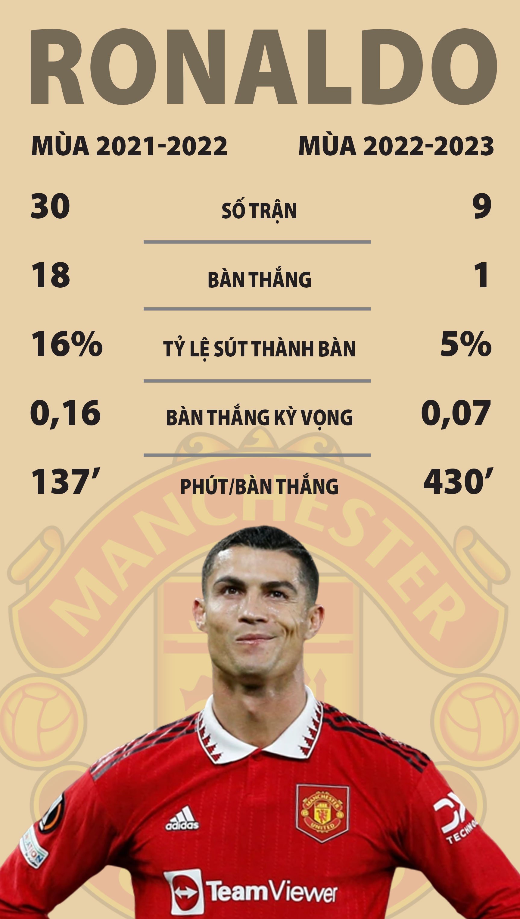 Ronaldo đã ra sân 9 lần tại Ngoại hạng Anh mùa 2022/23, trong đó có 3 lần đá chính. Với 430 phút trên sân, siêu sao người Bồ Đào Nha mới ghi 1 bàn - từ cú dứt điểm cận thành ấn định thắng lợi 2-1 trước Everton ở vòng 10 ngày 9/10.