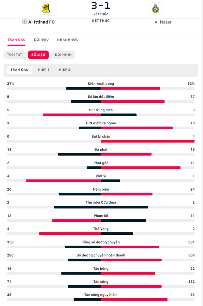 Phút 90+4, Muhannad Alshanqeeti sút tung lưới thủ thành Agustin Rossi để ấn định thắng lợi 3-1 cho Al Ittihad. Thua đau 1-3, Al Nassr của Ronaldo đành nhìn đối thủ tiến vào chơi trận chung kết Siêu cúp Saudi Arabia 2022, đối đầu Al Feiha vào lúc 01h00 ngày 30/1. Trong khi đó, trận đấu tiếp theo của Al Nassr sẽ là khi họ làm khách của Al Fateh lúc 22h00 tối ngày 3/2 ở vòng 15 giải vô địch quốc gia Saudi Arabia.
