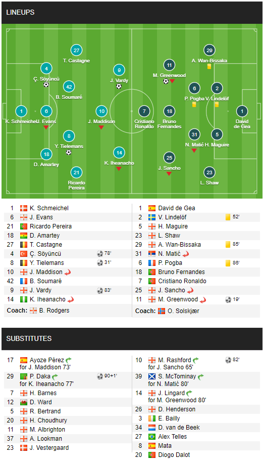Lần lượt Söyüncü rồi Vardi và Daka ghi bàn cho Leicester City ở các phút 79, 83, 91. Ở các tình huống thủng lưới này, hàng thủ Quỷ đỏ đều mắc các lỗi nghiêm trọng khi hết để đối phương vượt qua, lại bỏ không kèm người.