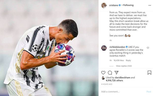 Chỉ sau ít giờ đăng tải, bài đăng của Ronaldo đã nhận về gần 5 triệu lượt thả tim. Các fan hâm mộ cũng gửi lời động viên để chân sút 35 tuổi sớm vượt qua nỗi buồn bị loại sớm tại Champions League.