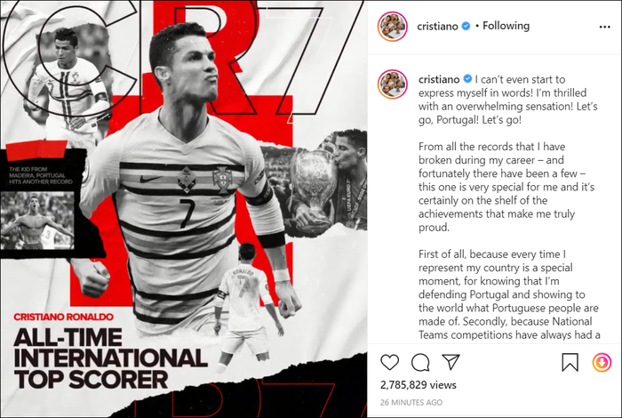 "Cảm ơn Bồ Đào Nha. Cảm ơn các đồng đội và đối thủ của tôi đã làm cho hành trình này càng trở nên thật khó quên. Hãy tiếp tục ra sân, bởi tôi vẫn chưa muốn dừng lại đâu...", siêu sao sinh năm 1985 kết thúc với lời hứa hẹn sẽ còn nâng cao kỷ lục ghi bàn ở cấp ĐTQG.