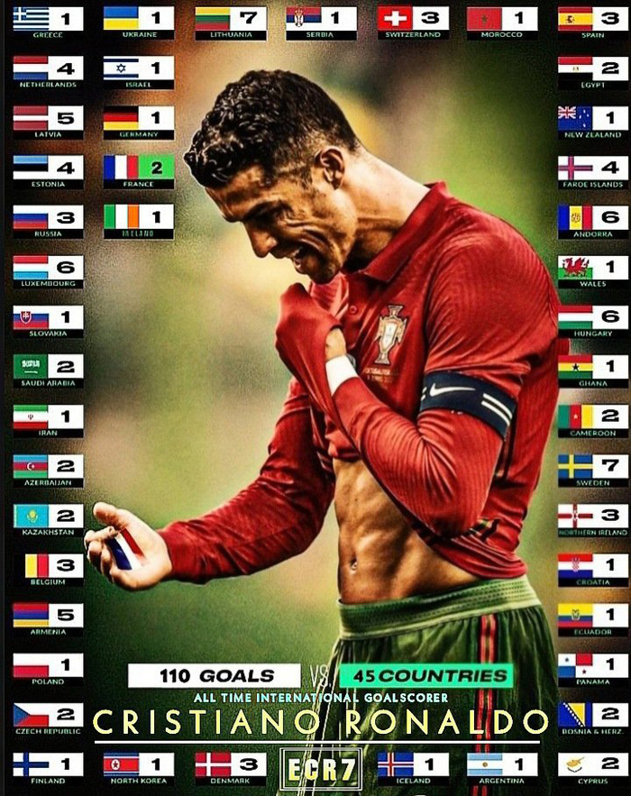 Và cũng chẳng đâu xa, ngày 7/9 tới, Ronaldo sẽ tiếp tục có cơ hội nâng cao thành tích ghi bàn của mình khi tuyển Bồ Đào Nha có chuyến làm khách trên sân đối thủ bị đánh giá yếu nhất bảng A, Azerbaijan. Trong sự nghiệp, CR7 từng 2 lần chọc thủng lưới đại diện Đông Âu này.