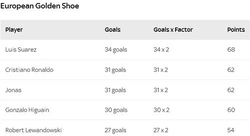 Còn trong cuộc đua giành giày vàng châu Âu, Luis Suarez đang dẫn đầu khi có 68 điểm. Những cầu thủ lần lượt xếp sau tiền đạo của Barca là Ronaldo (Real, 62 điểm), Jonas (Benfica, 62 điểm), Gonzalo Higuain (Napoli, 60 điểm) và Robert Lewandowski (Bayern, 54 điểm).