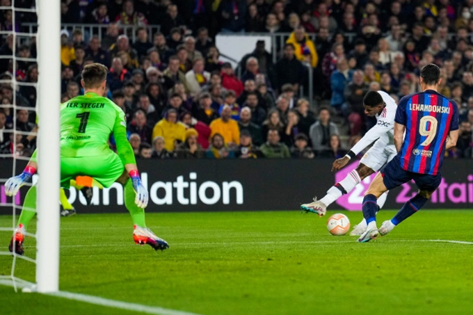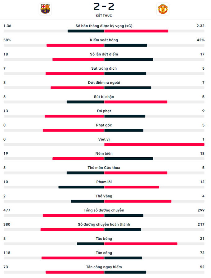 Càng về cuối, sức ép mà Barca tạo ra ngày càng lớn, khiến cầu môn MU thường xuyên bị đặt trong tình trạng báo động. Rất may là thầy trò Ten Hag đã trụ vững để có thể rời Camp Nou với kết quả hòa 2-2 chung cuộc.