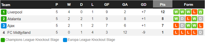 Niềm vui nhân đôi với thầy trò HLV Juergen Klopp khi ở trận đấu cùng giờ, Atalanta bất ngờ bị đội cuối bảng Midtjylland cầm hòa 1-1. Kết quả này giúp Liverpool chắc suất đi tiếp với vị trí nhất bảng D và sẽ là cơ hội để các trụ cột được nghỉ ngơi ở lượt trận cuối