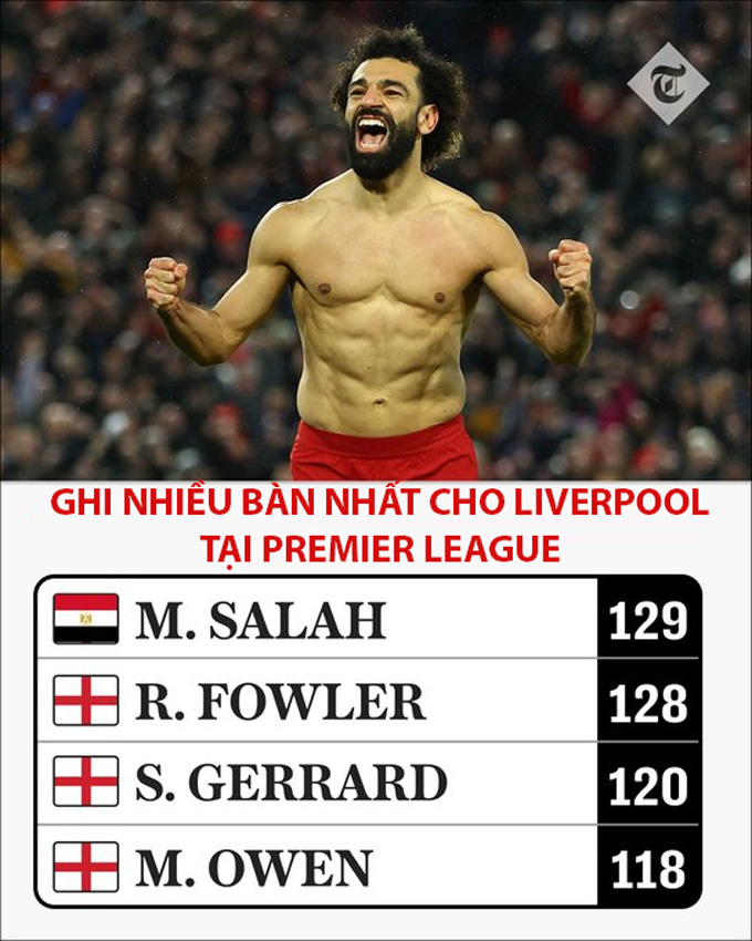 Với 2 bàn thắng ở trận đấu này, Salah đã chính thức vượt qua Robbie Fowler để trở thành cầu thủ ghi nhiều bàn nhất lịch sử Liverpool tại đấu trường Premier League. Anh đã có được 129 bàn chỉ sau 205 lần ra sân.