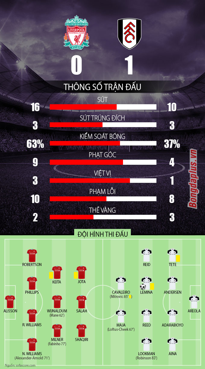 Trong những phút còn lại, Fulham dồn toàn bộ đội hình về phần sân nhà để bảo toàn lợi thế mong manh. Họ đã thành công trong việc khóa chặt các mũi nhọn Liverpool khiến The Kop chìm sâu hơn vào khủng hoảng.