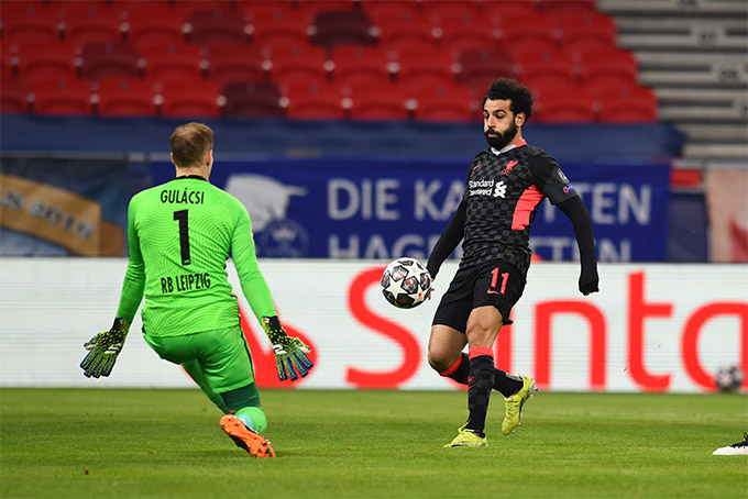 Sau pha bóng hút chết đó, Liverpool chấn chỉnh lại đội hình và nhanh chóng tổ chức những đường lên bóng ở tốc độ cao. Phút 15, Thiago có pha chọc khe thông minh để Mohamed Salah phá bẫy việt vị và thoát xuống đối mặt với thủ thành Gulacsi. Tuy nhiên, cú dứt điểm của ngôi sao người Ai Cập đã không thành công.