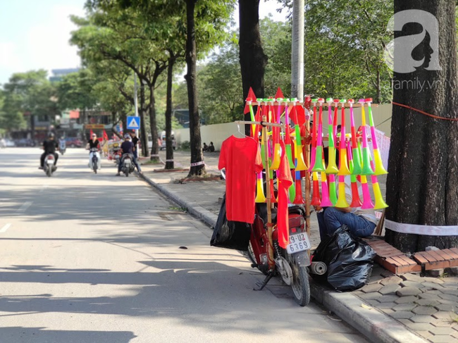 Còn khu vực C-D là 1,5 triệu đồng một cặp. Vào lúc này, do vé không sốt nên rất sẵn và cỡ nào cũng có. Bên cạnh đó, không khí xung quanh sân cũng được hâm nóng dần dọc khắp con đường dẫn vào sân Mỹ Đình, cờ đỏ sao vàng và kèn được bày bán từ khá sớm.
