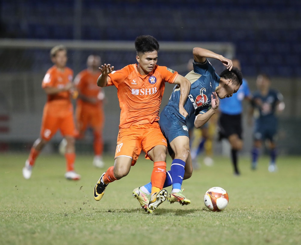 Phút 54 của trận đấu, sau pha chuyền bóng lỗi, Dụng Quang Nho lập tức phải đua tốc độ cùng Đình Duy để ngăn cản pha xuống bóng của cầu thủ đội chủ nhà.