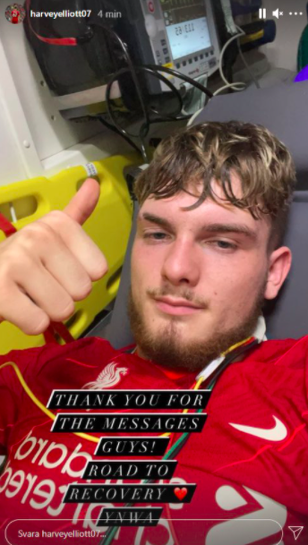 "Cảm ơn các bạn vì những tin nhắn động viên. Bây giờ là lúc bắt đầu quá trình hồi phục", Harvey Elliott viết vào bức ảnh đăng trên story Instagram, không quên đính kèm khẩu hiệu "You'll never walk alone" của Liverpool. Cầu thủ sinh năm 2003 giơ ngón tay cái, ra hiệu mình ổn.
