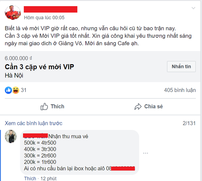 "Mua theo kênh chợ đen thì vé nào cũng có, ví dụ như cặp 400.000 đồng là 5-5,5 triệu đồng, nhưng cũng dễ mà bị lừa mua vé giả mà mình không thể biết được, đến khi mất tiền còn không được vào sân xem trận đấu", Tuấn Tú (một cổ động viên tại Hà Nội) cho biết.