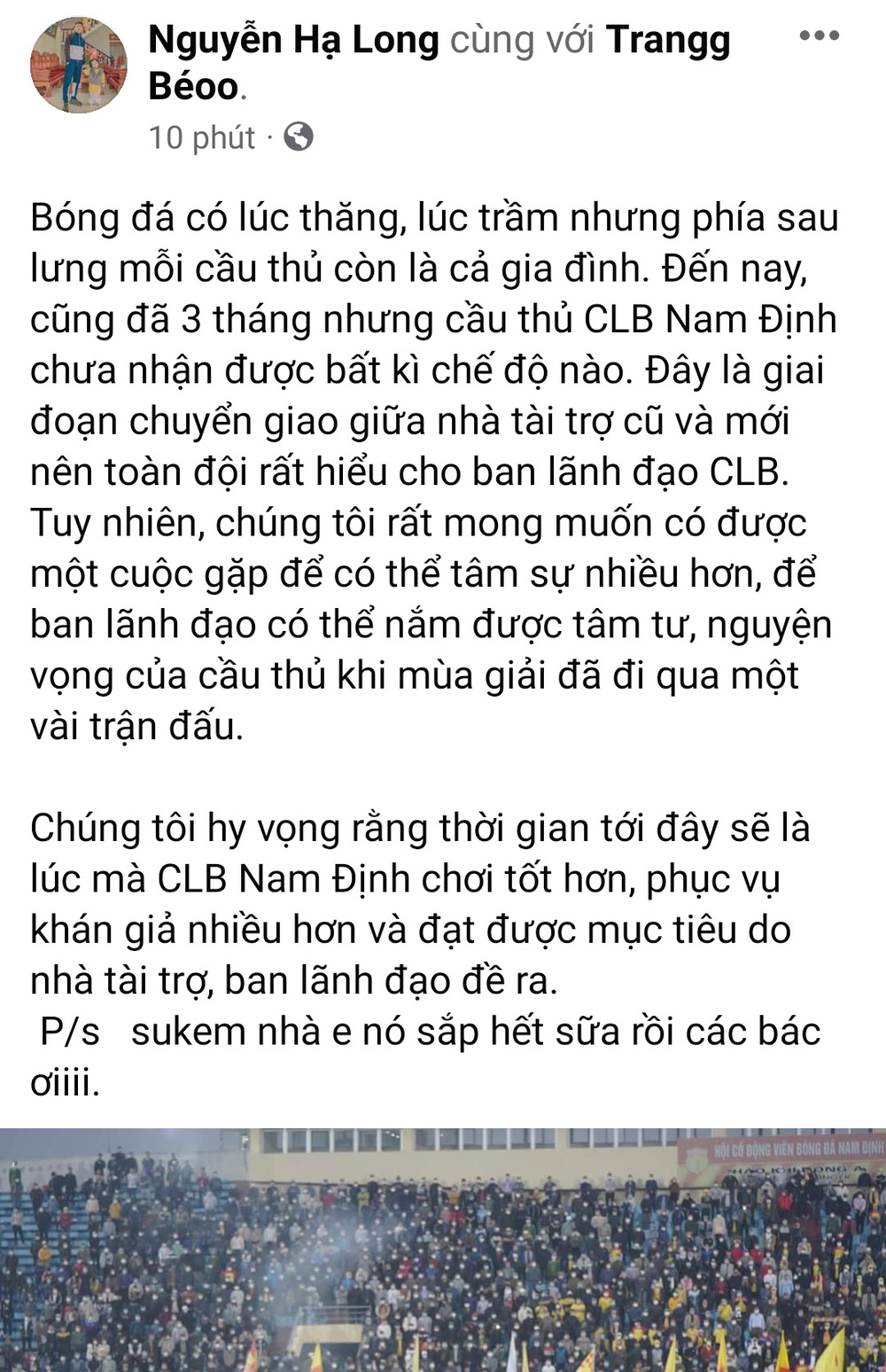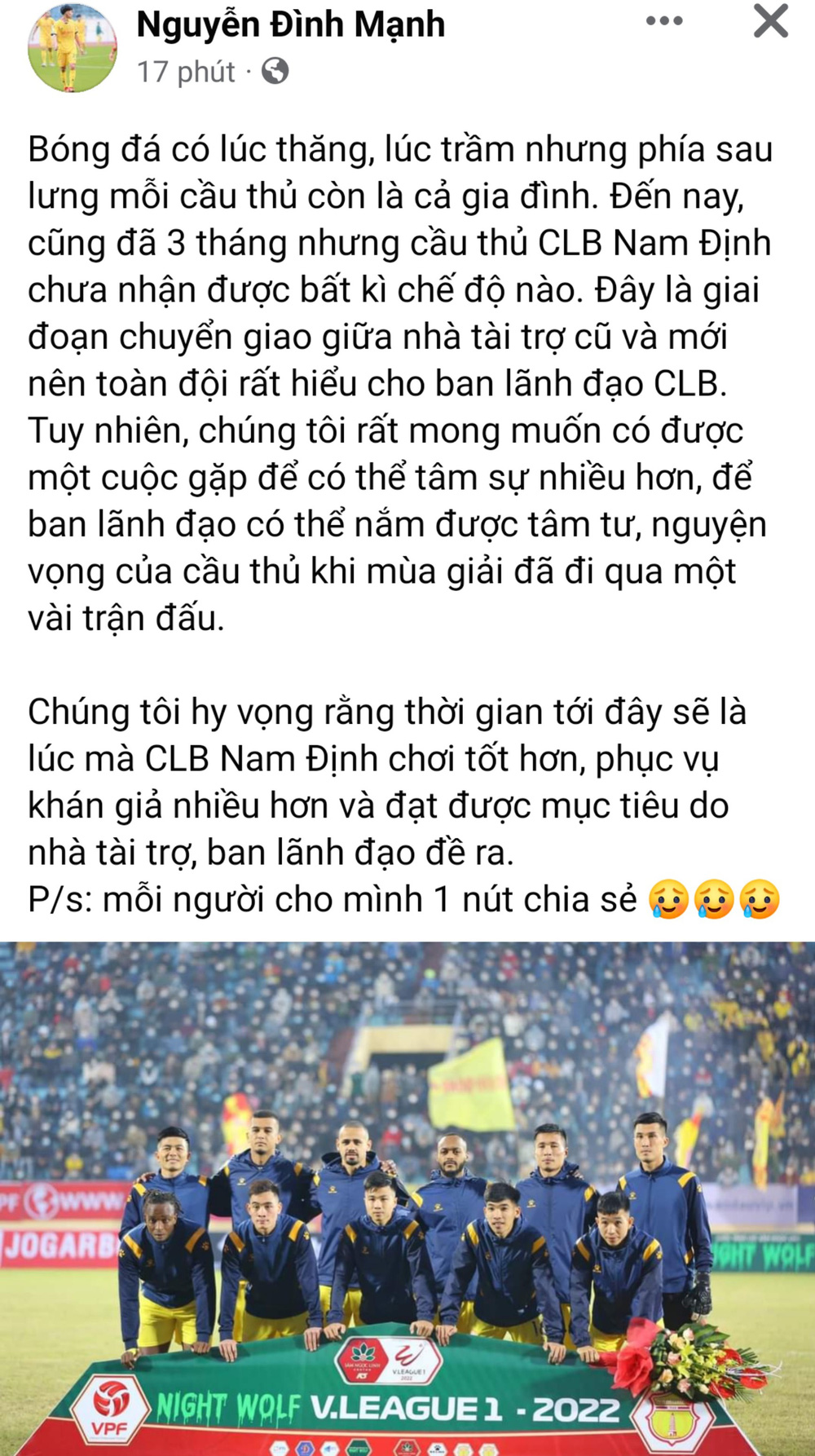 "Bóng đá có lúc thăng, lúc trầm nhưng phía sau lưng mỗi cầu thủ còn là cả gia đình. Đến nay, cũng đã 3 tháng nhưng cầu thủ CLB Nam Định chưa nhận được bất kì chế độ nào. Đây là giai đoạn chuyển giao giữa nhà tài trợ cũ và mới nên toàn đội rất hiểu cho ban lãnh đạo CLB. Tuy nhiên, chúng tôi rất mong muốn có được một cuộc gặp để có thể tâm sự nhiều hơn, để ban lãnh đạo có thể nắm được tâm tư, nguyện vọng của cầu thủ khi mùa giải đã đi qua một vài trận đấu.