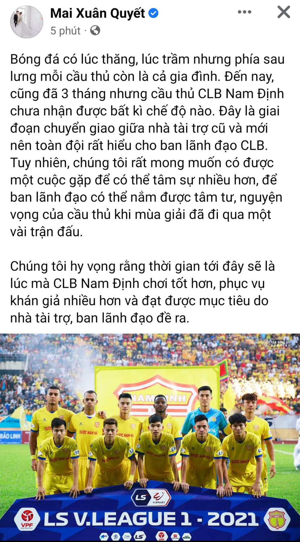 Tối ngày 31/3, bóng đá Việt Nam đã bất ngờ dậy sóng khi hàng loạt cầu thủ của CLB Nam Định đăng đàn "tố" đội nhà nợ lương. Trong đó, bài đăng của tuyển thủ U23 Việt Nam - Mai Xuân Quyết nhận được nhiều sự chú ý. Theo cầu thủ sinh năm 1999, đã ba tháng anh và các đồng đội chưa nhận được bất kỳ chế độ nào dù mùa giải đã khởi tranh được 4 vòng đấu.
