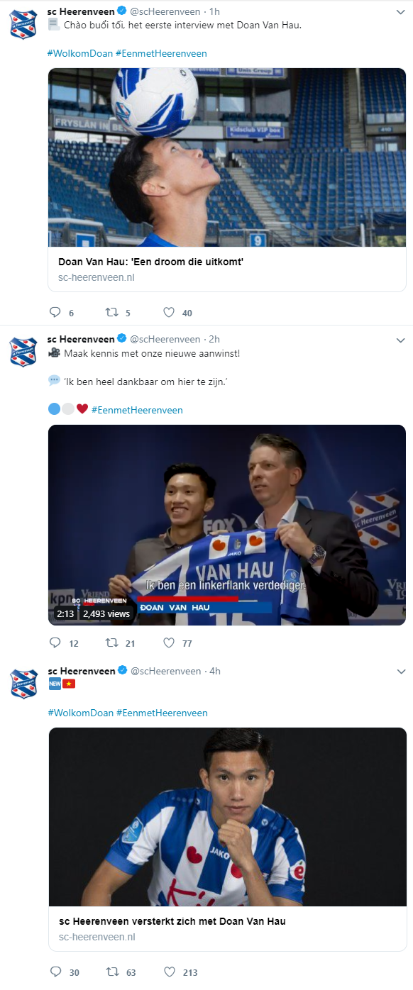Twitter của Heerenveen cũng đăng tải rất nhiều tin tức về Đoàn Văn Hậu.
