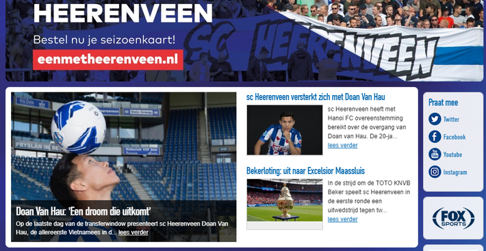 Trong khi đó, trang chủ CLB cũng đưa liền 2 tin về ngôi sao Việt Nam. Bài viết ở tiêu điểm to nhất là phát biểu của Văn Hậu có tựa đề: "Đoàn Văn Hậu: "Giấc mơ đã trở thành hiện thực". Một tin khác có tựa đề: "Heerenveen tăng cường sức mạnh bằng Đoàn Văn Hậu".
