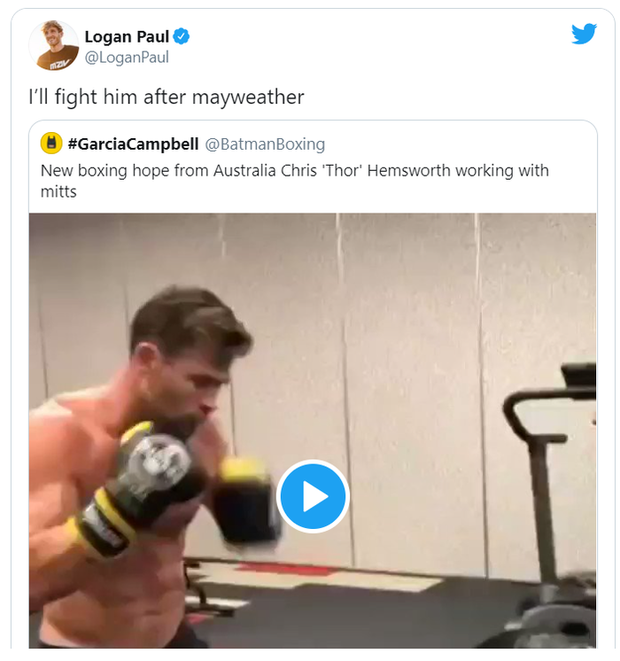 Phải tới ngày 20/2 tới, YouTuber tai tiếng Logan Paul mới thượng đài biểu diễn cùng nhà cựu vô địch thế giới ở 5 hạng cân Floyd Mayweather. Tuy nhiên, ngay từ lúc này, tay đấm 25 tuổi đã bắt tay vào tìm đối thủ tiếp theo. Và người được chọn khá bất ngờ lại là tài tử Chris Hemsworth, người thủ vai "Thần sấm Thor" trong loạt bom tấn "Biệt Đội Siêu Anh Hùng".